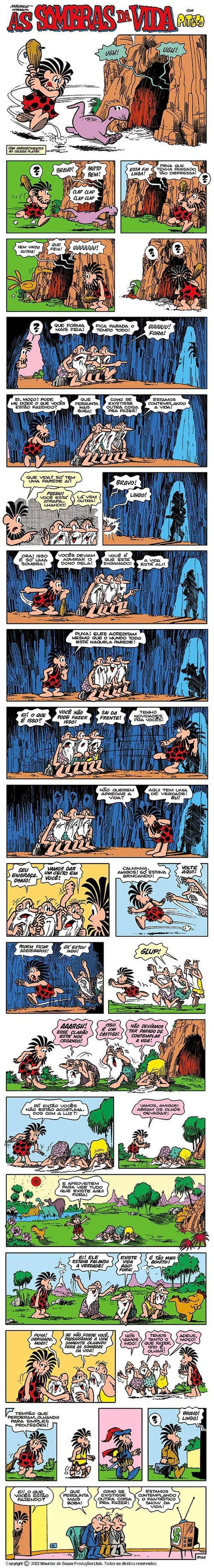 Abaixo uma história em quadrinhos do Piteco, personagem de Maurício de Sousa, que capta perfeitamente a essência do que Platão queria dizer.